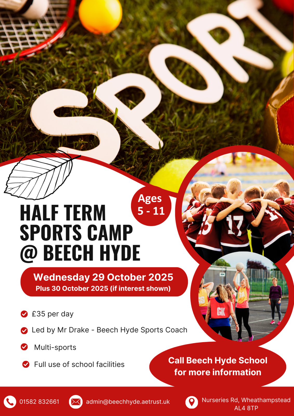 Beech Hyde is running a Sports Holiday club during the school holidays The club will be run by Beech Hyde's very own Sports Coach Mr Drake, and will focus on a variety of sports. Children can attend some, or all five days.