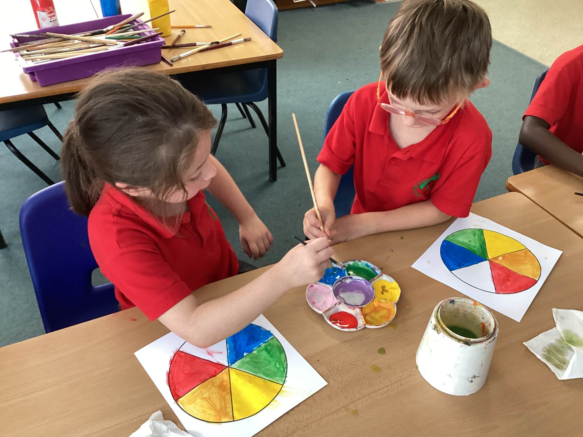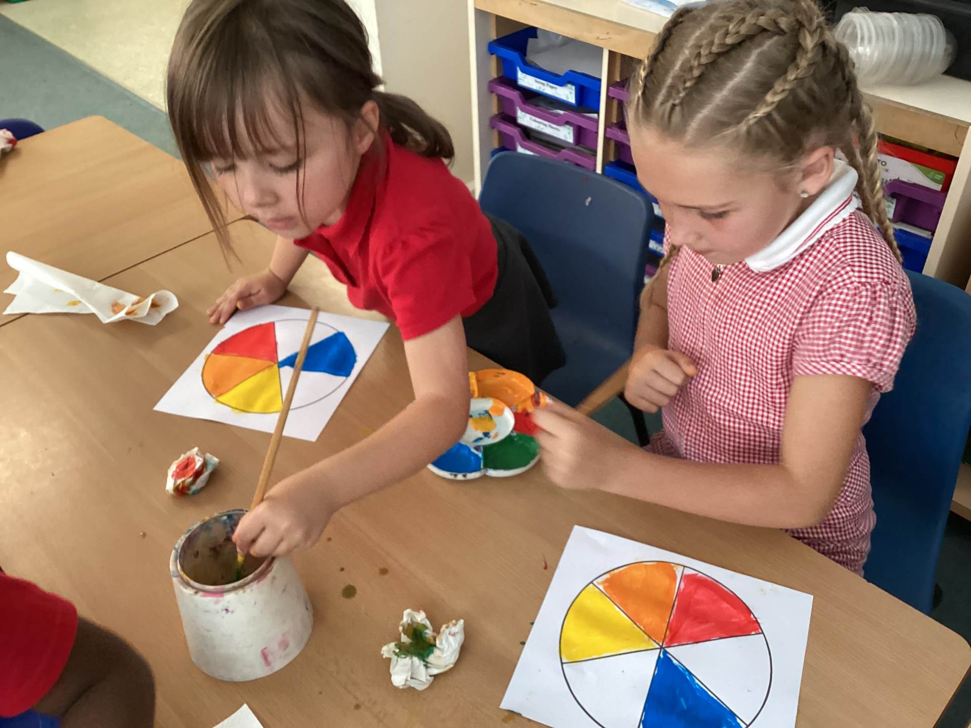 In Art, Year 2 have been exploring the work of Paul Klee, using drawing and painting to capture his unique style. They are developing their skills with colour, pattern, line, shape, form, and space. Their first step? Learning to mix primary colours to create a rainbow of secondary shades—a perfect start to their artistic journey!